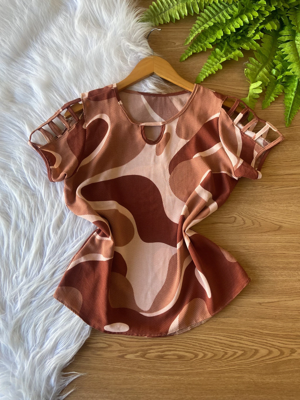 Essa blusa foi fabricada no tecido Crepe. O crepe é um tipo de tecido leve, conhecido por sua textura ondulada. Dispensando o uso de ferro de passar e tornando o seu uso muito mais prático. Além de ser um tecido respirável, ideal para os dias mais quentes, pois sua textura traz conforto e levesa.