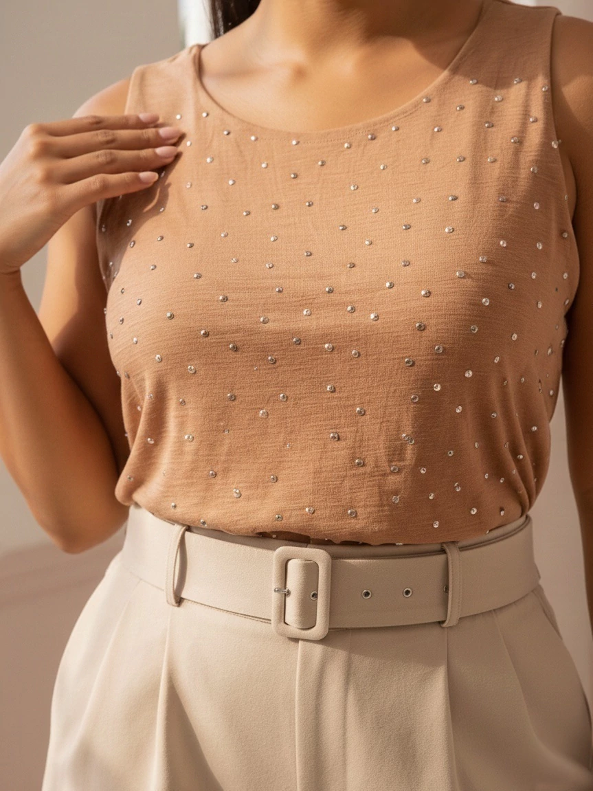 • O tecido duna é conhecido por sua leveza e caimento fluido, o que o torna ideal para peças que precisam ser confortáveis e que se movem bem.